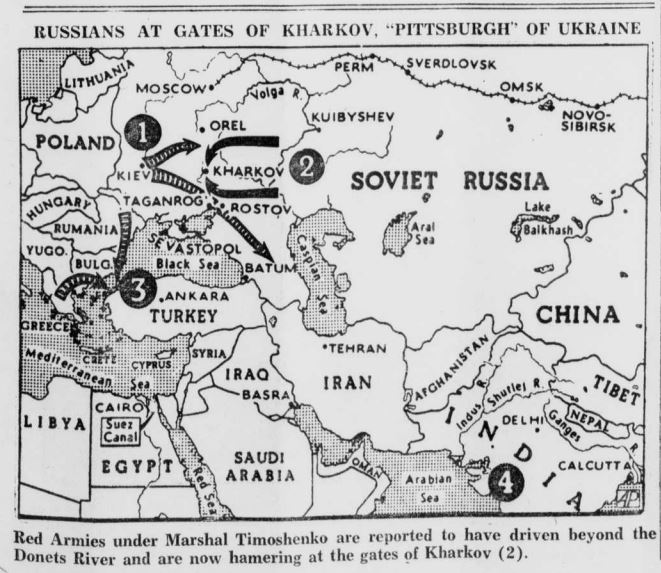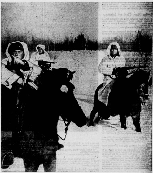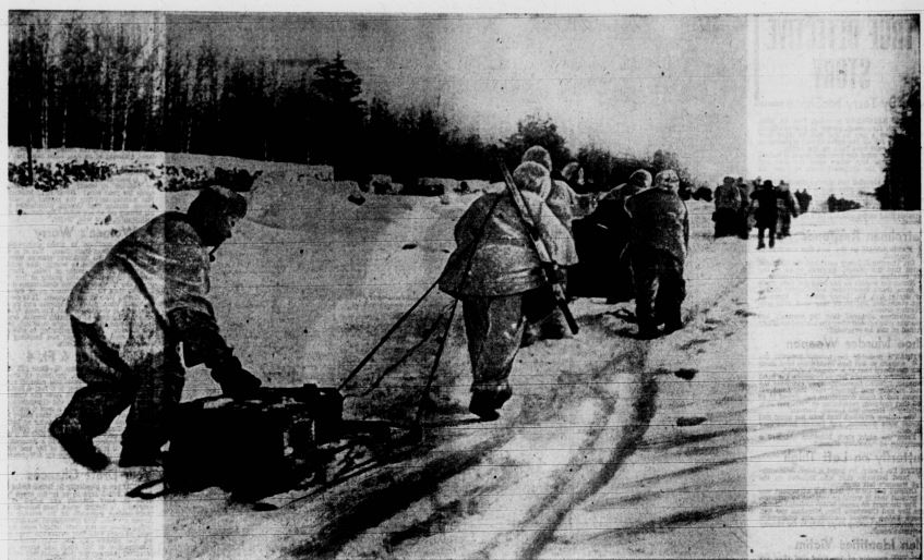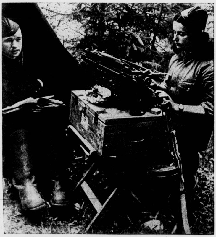 DISPLAYING DOGGED deterH mination and courage against almost unbelievable odds, troops of the Soviet Union not only are conquering the wintry blasts of the Russian waste lands but are overrunning the Nasi hordes On numerous fronts. These two Red army scouts are setting out for the enemys rear. FISH-LIKE rubber tubes and paddles aid the Russian fighter to cross a stream. Most of the bridges in Russia have been destroyed but that does not stop the Soviets from pursuing the hated Nazi columns. An an example of Russian ingenuity, engineers, working at night in freezing weather, built a bridge at Voronezh a foot under water while Nazis napped. NO BRIDGE NEEDED! Using blown-up rubber tubes shaped like a doughnut, Fighters of the Russian Army are shown crossing a river. They use paddles similar to but larger than ping-pong paddles. Freezing cold does not stop Red Army man from plunging into icy stream in their fight against Hitlers "Lost Army/ The Russian Army is now well-equipped due to the supplies sent by the United States. It its heroic battle the Red Army developed many new tricks of war to stop, kill and drive back the foe at Leningrad, Stalingrad and Moscow. Soviet resistance broke down the German offensive. SAPPERS AT WORK! Three Red Army tappers, doughnut canoes" in place, paddles and rifles ready, are shown about to wade into a river to reconnoiter the enemy on the Western Front. Notice the high, heavy fishermans boots. Sappers cut the eremys lines; blow up ammunition dumps; and blast enemy fortifications. They strike suddenly, swiftly, silently, upon the enemy. TWO TYPEWRITERS! This woman soldier-attache of the Soviet Armys headquarters on the Northern Front is shown busily taking orders from an officer. Competently and expertly as a "steno" in an American business office, she types the da/t com* mands. But beside her rests a "typewriter" of M kind far different. It, too, writes a letter-�Death� to Nazi Foe. WARRIORS IN FEATHERBEDS! It was the white-clad Russian fighters which brought black terror to the Nazis in Russia. Silent, swift, camouflaged into the driven snows of the steppes, they swooped against Hitlers Lost Legions, killing the invader with ruthless vengeance. Above is shown light-artillerymen bringing up their guns and ammunition along a frozen road. Sub-zero weather and snow blanketed the dreams of Herr Adolf of taking Leningrad, Stalingrad, Moscow. Russian bullets, whistling in the screaming Russian winds, swept the Nazis back toward the German border. SNOW SPEEDER Clever at adapting their motorized equipment to the snow, the Russians developed this snow-o-cycle for speed. Steel runners on the sides allow the motorcycle to zip along over drifts without bogging down. The Nazis started the lightning war-the Russians improved it to meet their needs in Winter weather. Winter was their ally. PONY PATROL! Small, tough Russian ponies, built like our Western pinfos, bear Soviet scouts out on a reconnaissance patrol on the Middle Don front. Despite all the mechanization of warfare, conditions often force an army to revert to "old-fashioned" methods. Our fighters in the Solomons and New Guinea found that the foot waft faster in the jungle than motorised carriers.